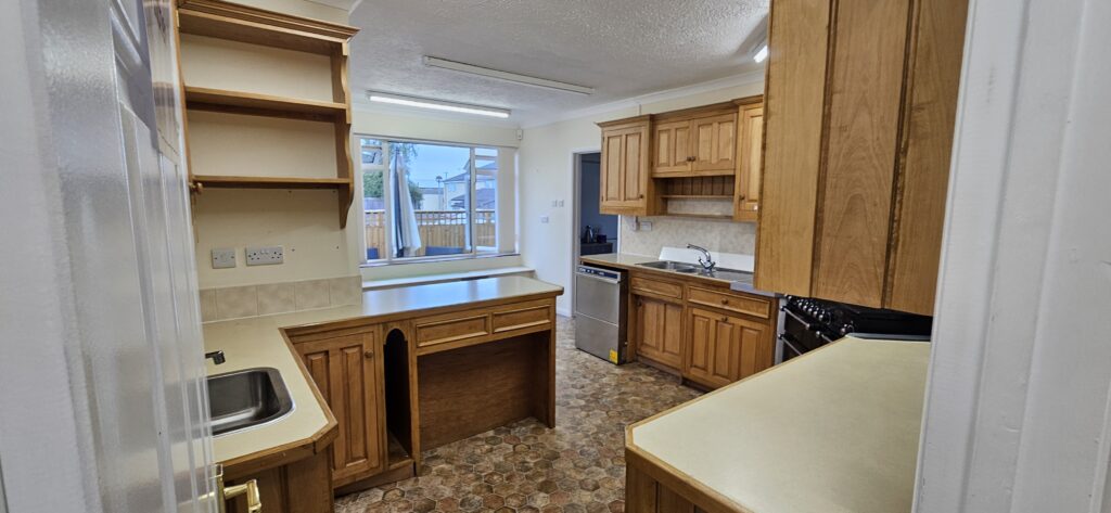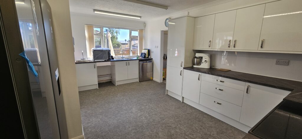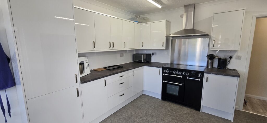 Although this kitchen served its purpose, it was time for an upgrade. There is plenty of cupboard space; however, the oven doors could not open completely because of the cooker’s placement. The objective was to relocate the washing area to create additional work surface, as well as to eliminate the island and reposition the cooker. The client desired a glossy white kitchen featuring a double sink and a basin for handwashing.